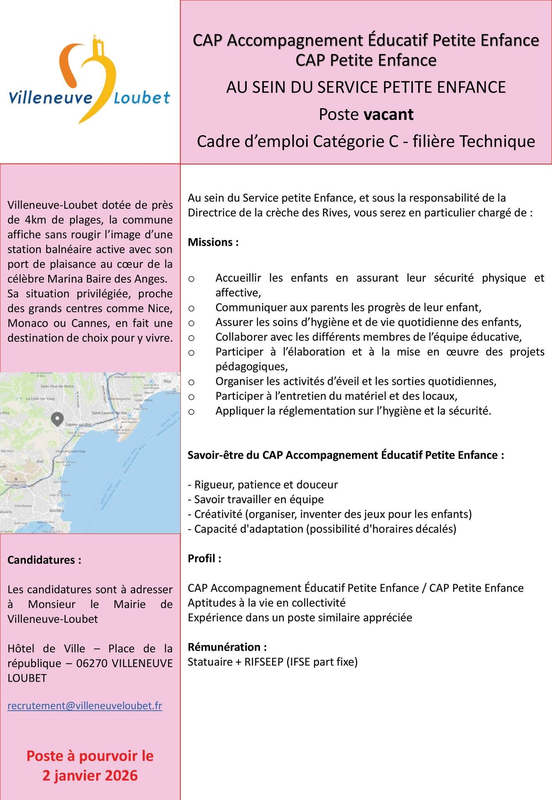 Le mardi 18 novembre 2025 à 9h00 à France Travail de Menton, ne manquez pas cette opportunité d'emploi et devenez Assistant(e) Maternel(le) à domicile salarié(e) de la commune à temps complet (statut agent municipal) en CDI.